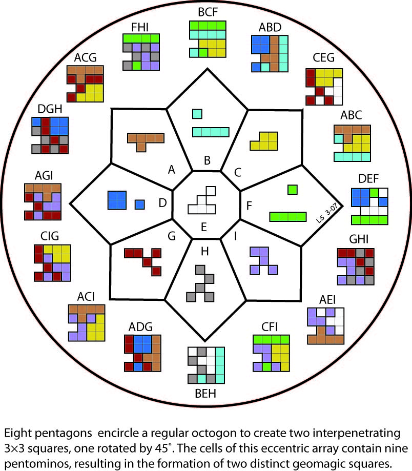 This figure contains four “cliques” of four points each, with each of the four points in each clique connected to each of the others, and each pair of cliques intersecting at a single point. Four colors suffice to color all the points so that no two linked points share a color.