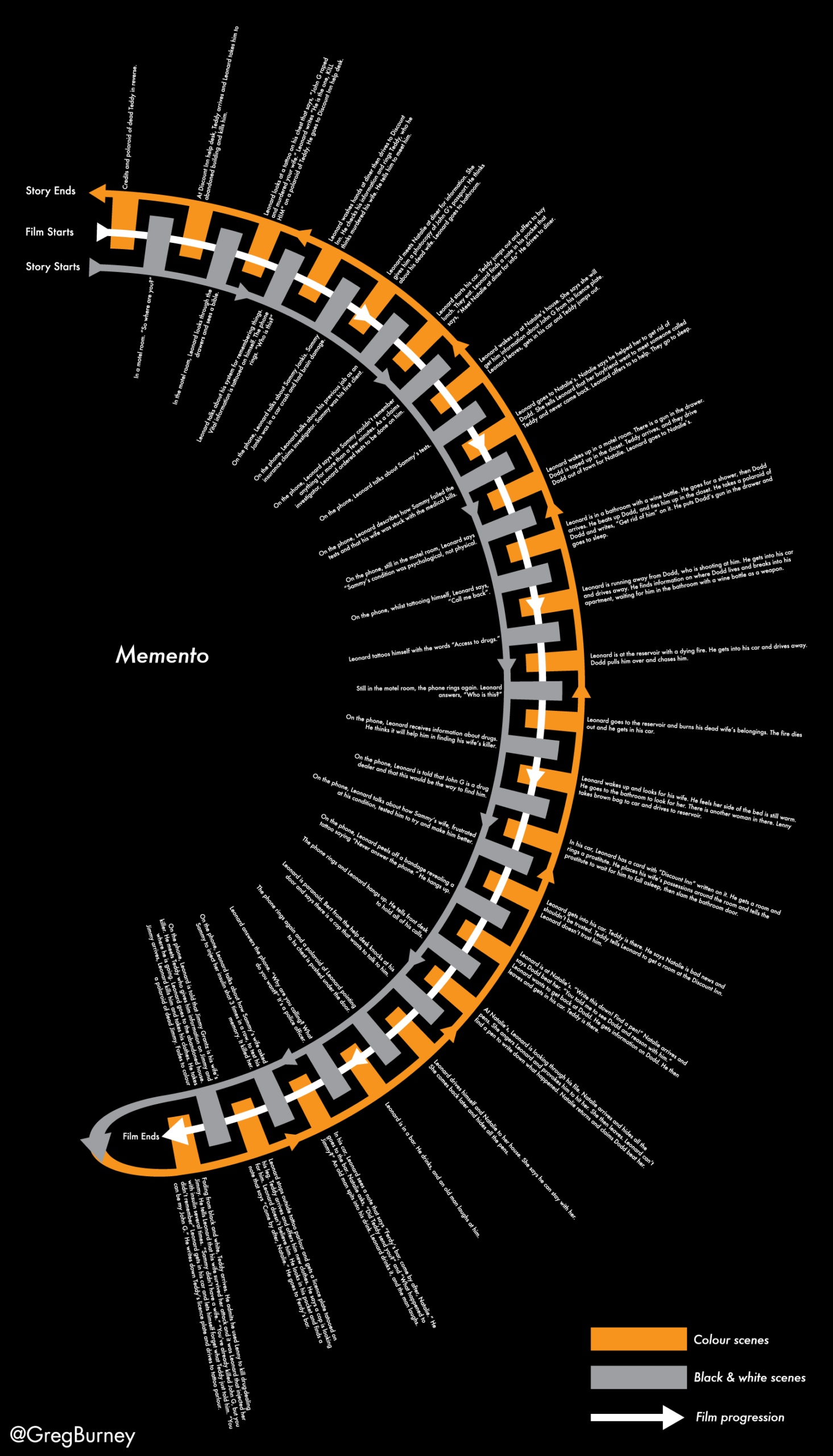 Christopher Nolan’s 2000 film Memento, about a man who has lost his memory, tells a coherent story in a disjointed order (click to enlarge). Scenes from the first half of the story, shot in black and white, are presented in chronological order. Scenes from the second half, shot in color, are presented in reverse chronology. The film alternates between these two timelines, beginning at the start/end and arriving at the middle — which acknowledges the advent of color with the development of a Polaroid photograph.