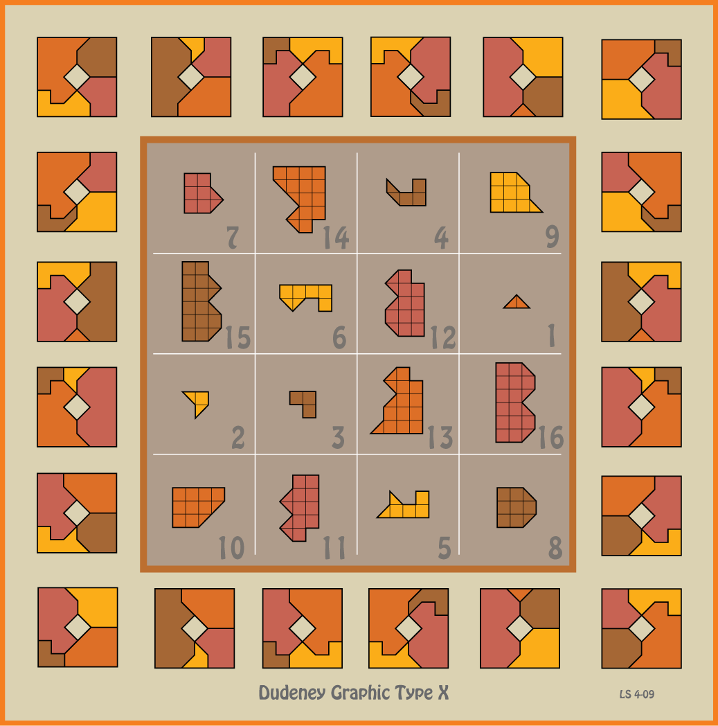 “In his book Amusements in Mathematics, H.E. Dudeney presents a method of classifying 4×4 magic squares based on the distribution of their 8 complementary pairs 1 & 16, 2 & 15, .., 8 & 9. There are just 12 distinct such distributions or ‘graphic types’, which he labelled I to XII. The square above is an example of a type X square.”