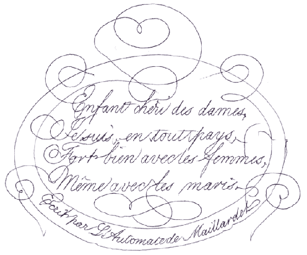 The final poem contained a surprise — in its border the machine wrote Ecrit par L’Automate de Maillardet, “written by the automaton of Maillardet.” The automaton’s creator was not Johann Maelzel but the Swiss mechanician Henri Maillardet — and this fact had been remembered only because he had taught the machine to write his name.